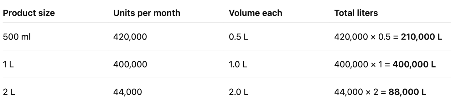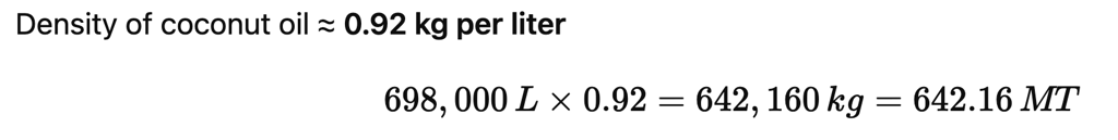 Total coconut oil volume = 210,000 + 400,000 + 88,000 = 698,000 liters per month